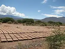On construisait aussi avec des briques desséchées au soleil et posées avec un mortier d'argile, à la manière adoptée en Lorraine : l'exécution étant facile et peu coûteuse. On labourait en plusieurs sens une portion de terre dont la surface est calculée en raison de la dimension du bâtiment à construire ; on battait avec une masse cette portion de terre et la forme en surface unie ; puis, avec des règles et un tranchant, on coupait cette terre battue en lignes droites, espacées de 8 à 9 pouces, et par d'autres transversales de quatre à cinq pouces de distance. Tous ces carreaux ainsi tracés présentaient un champ couvert de briques. On laissait cette terre bien sécher et prendre le plus de consistance possible, et, après un temps convenable, on enlevait chaque carreau qui présentait alors la forme d'une brique de deux pouces environ d'épaisseur. C'est avec de pareilles briques qu'on élevait un bâtiment, en posant chaque assise, à la manière ordinaire, sur un lit de la même terre délayée en consistance de mortier[13].