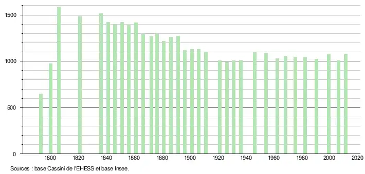 L'évolution du nombre d'habitants est connue à travers les recensements de la population effectués dans la commune depuis 2016. Pour les communes de moins de 10 000 habitants, une enquête de recensement portant sur toute la population est réalisée tous les cinq ans, les populations légales des années intermédiaires étant quant à elles estimées par interpolation ou extrapolation[34]. Pour la commune, le premier recensement exhaustif entrant dans le cadre du nouveau dispositif a été réalisé en 2019[35].