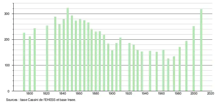 L'évolution du nombre d'habitants est connue à travers les recensements de la population effectués dans la commune depuis 1793. À partir du , les populations légales des communes sont publiées annuellement dans le cadre d'un recensement qui repose désormais sur une collecte d'information annuelle, concernant successivement tous les territoires communaux au cours d'une période de cinq ans. Pour les communes de moins de 10 000 habitants, une enquête de recensement portant sur toute la population est réalisée tous les cinq ans, les populations légales des années intermédiaires étant quant à elles estimées par interpolation ou extrapolation[3]. Pour la commune, le premier recensement exhaustif entrant dans le cadre du nouveau dispositif a été réalisé en 2008[4],[Note 1].