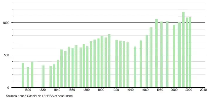 L'évolution du nombre d'habitants est connue à travers les recensements de la population effectués dans la commune depuis 1793. Pour les communes de moins de 10 000 habitants, une enquête de recensement portant sur toute la population est réalisée tous les cinq ans, les populations légales des années intermédiaires étant quant à elles estimées par interpolation ou extrapolation[23]. Pour la commune, le premier recensement exhaustif entrant dans le cadre du nouveau dispositif a été réalisé en 2007[24].