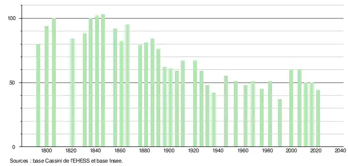 L'évolution du nombre d'habitants est connue à travers les recensements de la population effectués dans la commune depuis 1793. Pour les communes de moins de 10 000 habitants, une enquête de recensement portant sur toute la population est réalisée tous les cinq ans, les populations légales des années intermédiaires étant quant à elles estimées par interpolation ou extrapolation[16]. Pour la commune, le premier recensement exhaustif entrant dans le cadre du nouveau dispositif a été réalisé en 2006[17].