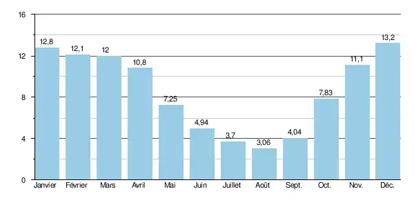 Les crues peuvent être importantes compte tenu de la petitesse du bassin versant (187 km2 seulement). Les QIX 2 et QIX 5 valent respectivement 97 et 110 m3/s. Le QIX 10 est de 120 m3/s, le QIX 20 de 130 m3/s, tandis que le QIX 50 se monte à 150 m3/s.