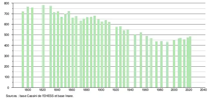 L'évolution du nombre d'habitants est connue à travers les recensements de la population effectués dans la commune depuis 1793. Pour les communes de moins de 10 000 habitants, une enquête de recensement portant sur toute la population est réalisée tous les cinq ans, les populations légales des années intermédiaires étant quant à elles estimées par interpolation ou extrapolation[19]. Pour la commune, le premier recensement exhaustif entrant dans le cadre du nouveau dispositif a été réalisé en 2008[20].