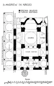 Il est difficile de retrouver le plan original de l’église en raison des modifications apportées lors de sa transformation en mosquée et des rénovations qui suivirent le tremblement de terre de 1765[9]. Son axe va de l’est-nord-est vers l’ouest-sud-ouest. Au centre se trouve un *dôme[N 1] flanqué de trois *absides à l’est, d’un *esonarthex et d’un *exonarthex à l’ouest. Sur trois de ses côtés, le *dôme central était entouré d’*arcs surmontés de *voutes en berceau. Lors de la transformation en mosquée, on transféra l’entrée sur le côté nord où les Ottomans construisirent une *arcade de style turc. Le *mihrab se trouve sur le côté sud, permettant aux fidèles de prier en direction de La Mecque. Du côté est, on a ajouté une salle dans laquelle se regroupent les femmes durant la prière; du côté ouest se trouve une autre salle où les *derviches du *tékké attenant à la mosquée tenaient leurs réunions. L’aile nord a également été structuralement modifiée et a été surmontée de *dômes de style turc[9].