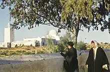 Kamel Tmarzizet évoque les « coupoles qui émergent de la masse étalée de l'édifice » dominé par un minaret carré et formé de deux tours, « dont l'inférieure est décorée par des petites fenêtres aveugles ». La tour supérieure porte quant à elle, sous ses parapets crénelés, des inscriptions en arabe.