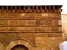 Plus haut se trouvent deux bandeaux calligraphiés (IXe siècle) ornés d'une écriture kufique en relief, dont les hampes des lettres sont biseautées et présentent des versets coraniques ainsi que le nom du fondateur et la date de construction, qui sont séparés par une frise à décoration essentiellement florale ; parmi les motifs se distinguent des paires de rosettes, des rosaces à huit branches composées de palmettes à cinq lobes ou de demi-fleurons ainsi que des fleurs à huit pétales en forme d'étoile[1].