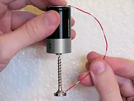 Moteur homopolaire simple fabriqué avec une vis, une pile, un fil conducteur et un aimant circulaire.