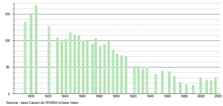 L'évolution du nombre d'habitants est connue à travers les recensements de la population effectués dans la commune depuis 1793. Pour les communes de moins de 10 000 habitants, une enquête de recensement portant sur toute la population est réalisée tous les cinq ans, les populations légales des années intermédiaires étant quant à elles estimées par interpolation ou extrapolation[5]. Pour la commune, le premier recensement exhaustif entrant dans le cadre du nouveau dispositif a été réalisé en 2006[6].