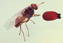 - Wolbachia, notamment W. pipientis, est présent dans les tissus des gonades. Il intervient dans la reproduction, l'immunité et la longévité[10],[12] ;
