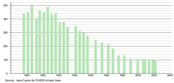 L'évolution du nombre d'habitants est connue à travers les recensements de la population effectués dans la commune depuis 1856. Pour les communes de moins de 10 000 habitants, une enquête de recensement portant sur toute la population est réalisée tous les cinq ans, les populations légales des années intermédiaires étant quant à elles estimées par interpolation ou extrapolation[42]. Pour la commune, le premier recensement exhaustif entrant dans le cadre du nouveau dispositif a été réalisé en 2008[43].