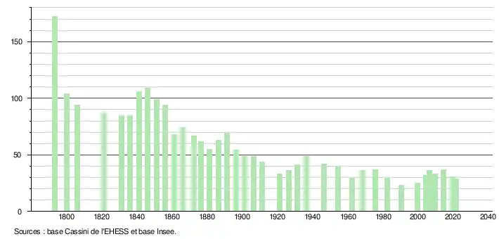 L'évolution du nombre d'habitants est connue à travers les recensements de la population effectués dans la commune depuis 1793. Pour les communes de moins de 10 000 habitants, une enquête de recensement portant sur toute la population est réalisée tous les cinq ans, les populations légales des années intermédiaires étant quant à elles estimées par interpolation ou extrapolation[14]. Pour la commune, le premier recensement exhaustif entrant dans le cadre du nouveau dispositif a été réalisé en 2004[15].