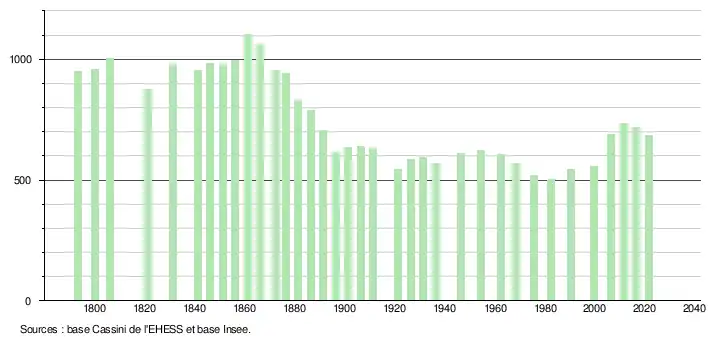 L'évolution du nombre d'habitants est connue à travers les recensements de la population effectués dans la commune depuis 1793. Pour les communes de moins de 10 000 habitants, une enquête de recensement portant sur toute la population est réalisée tous les cinq ans, les populations légales des années intermédiaires étant quant à elles estimées par interpolation ou extrapolation[39]. Pour la commune, le premier recensement exhaustif entrant dans le cadre du nouveau dispositif a été réalisé en 2006[40].