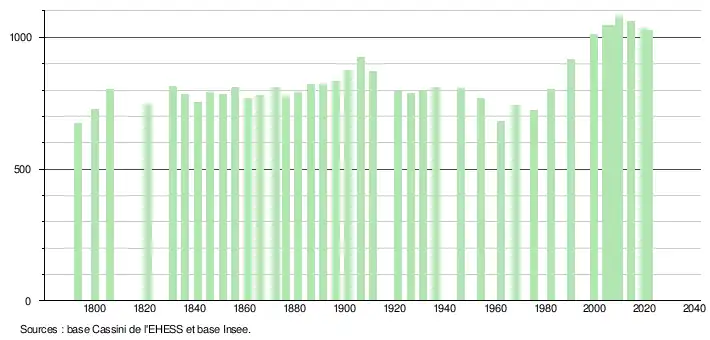 L'évolution du nombre d'habitants est connue à travers les recensements de la population effectués dans la commune depuis 1793. Pour les communes de moins de 10 000 habitants, une enquête de recensement portant sur toute la population est réalisée tous les cinq ans, les populations légales des années intermédiaires étant quant à elles estimées par interpolation ou extrapolation[31]. Pour la commune, le premier recensement exhaustif entrant dans le cadre du nouveau dispositif a été réalisé en 2004[32].