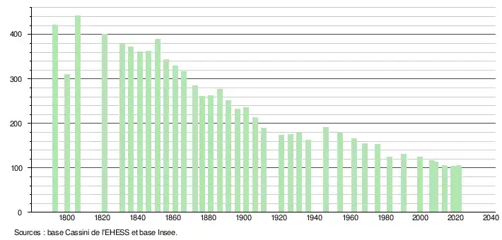 L'évolution du nombre d'habitants est connue à travers les recensements de la population effectués dans la commune depuis 1793. Pour les communes de moins de 10 000 habitants, une enquête de recensement portant sur toute la population est réalisée tous les cinq ans, les populations légales des années intermédiaires étant quant à elles estimées par interpolation ou extrapolation[15]. Pour la commune, le premier recensement exhaustif entrant dans le cadre du nouveau dispositif a été réalisé en 2008[16].