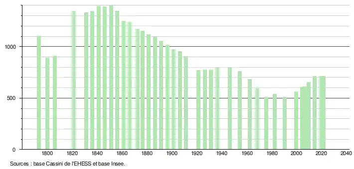 L'évolution du nombre d'habitants est connue à travers les recensements de la population effectués dans la commune depuis 1793. Pour les communes de moins de 10 000 habitants, une enquête de recensement portant sur toute la population est réalisée tous les cinq ans, les populations légales des années intermédiaires étant quant à elles estimées par interpolation ou extrapolation[23]. Pour la commune, le premier recensement exhaustif entrant dans le cadre du nouveau dispositif a été réalisé en 2004[24].
