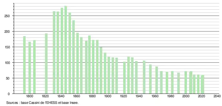 L'évolution du nombre d'habitants est connue à travers les recensements de la population effectués dans la commune depuis 1793. Pour les communes de moins de 10 000 habitants, une enquête de recensement portant sur toute la population est réalisée tous les cinq ans, les populations légales des années intermédiaires étant quant à elles estimées par interpolation ou extrapolation[20]. Pour la commune, le premier recensement exhaustif entrant dans le cadre du nouveau dispositif a été réalisé en 2005[21].