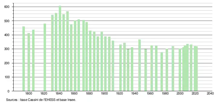 L'évolution du nombre d'habitants est connue à travers les recensements de la population effectués dans la commune depuis 1793. Pour les communes de moins de 10 000 habitants, une enquête de recensement portant sur toute la population est réalisée tous les cinq ans, les populations légales des années intermédiaires étant quant à elles estimées par interpolation ou extrapolation[24]. Pour la commune, le premier recensement exhaustif entrant dans le cadre du nouveau dispositif a été réalisé en 2004[25].
