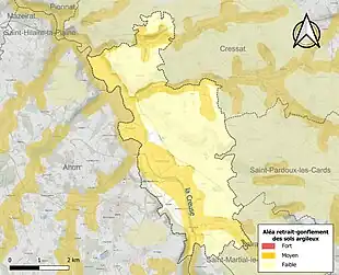 Le retrait-gonflement des sols argileux est susceptible d'engendrer des dommages importants aux bâtiments en cas d’alternance de périodes de sécheresse et de pluie. 40,3 % de la superficie communale est en aléa moyen ou fort (33,6 % au niveau départemental et 48,5 % au niveau national). Sur les 156 bâtiments dénombrés sur la commune en 2019, 46 sont en aléa moyen ou fort, soit 29 %, à comparer aux 25 % au niveau départemental et 54 % au niveau national. Une cartographie de l'exposition du territoire national au retrait gonflement des sols argileux est disponible sur le site du BRGM[17],[Carte 2].
