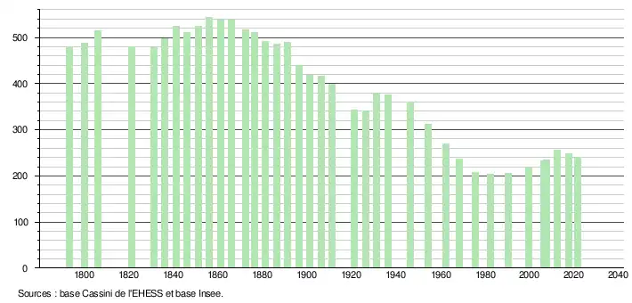 L'évolution du nombre d'habitants est connue à travers les recensements de la population effectués dans la commune depuis 1793. Pour les communes de moins de 10 000 habitants, une enquête de recensement portant sur toute la population est réalisée tous les cinq ans, les populations légales des années intermédiaires étant quant à elles estimées par interpolation ou extrapolation[27]. Pour la commune, le premier recensement exhaustif entrant dans le cadre du nouveau dispositif a été réalisé en 2007[28].