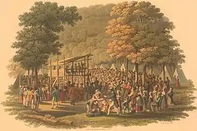 - Au Canada, le pasteur méthodiste James Caughey, missionnaire américain envoyé en Ontario par l’Église méthodiste wesleyenne (Wesleyan Methodist Church) des années 1840 jusqu’en 1864, réalisa des conversions massives, particulièrement dans l’ouest canadien dans les années 1851-1853 en combinant un appel modéré à l’émotion religieuse et un appel sans ambiguïté à l’engagement personnel, réalisant ainsi la synthèse entre le style émotionnel des « camp meetings » et les attentes d’un public méthodiste urbain plus sophistiqué[11]. Sous son ministère, un réveil a pris place en Ontario, en 1857[9].