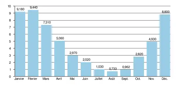 La rivière présente des fluctuations saisonnières de débit, avec des hautes eaux hivernales situées dans une fourchette allant de 7,31 à 9,44 m3/s, de décembre à mars inclus, et d'importants maigres d'été, entraînant une baisse du débit moyen mensuel jusqu'à 0,73 m3/s au mois d'août.