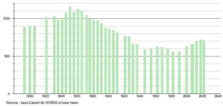 L'évolution du nombre d'habitants est connue à travers les recensements de la population effectués dans la commune depuis 1793. Pour les communes de moins de 10 000 habitants, une enquête de recensement portant sur toute la population est réalisée tous les cinq ans, les populations légales des années intermédiaires étant quant à elles estimées par interpolation ou extrapolation[30]. Pour la commune, le premier recensement exhaustif entrant dans le cadre du nouveau dispositif a été réalisé en 2007[31].