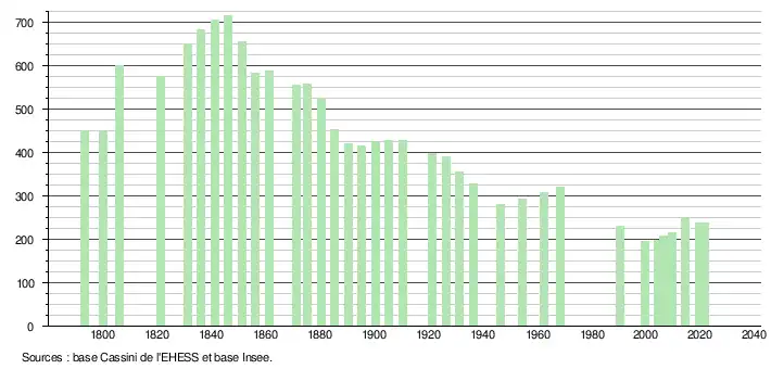 L'évolution du nombre d'habitants est connue à travers les recensements de la population effectués dans la commune depuis 1793. Pour les communes de moins de 10 000 habitants, une enquête de recensement portant sur toute la population est réalisée tous les cinq ans, les populations légales des années intermédiaires étant quant à elles estimées par interpolation ou extrapolation[14]. Pour la commune, le premier recensement exhaustif entrant dans le cadre du nouveau dispositif a été réalisé en 2004[15].