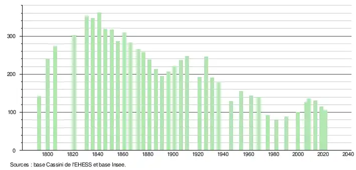 L'évolution du nombre d'habitants est connue à travers les recensements de la population effectués dans la commune depuis 1793. Pour les communes de moins de 10 000 habitants, une enquête de recensement portant sur toute la population est réalisée tous les cinq ans, les populations légales des années intermédiaires étant quant à elles estimées par interpolation ou extrapolation[23]. Pour la commune, le premier recensement exhaustif entrant dans le cadre du nouveau dispositif a été réalisé en 2008[24].