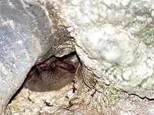 Le Murin de Natterer (M. nattereri), ici un individu en hibernation photographié en Belgique, est l'espèce la plus proche du Murin cryptique.