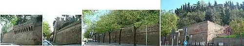 Ces murailles, partant du Torrione del Nuti en Piazza del Popolo et, dans un quart de cercle le long de la via Jacopo Mazzoni, forment la protection nord de la Rocca Malatestiana. Le seul accès, par le grand portail métallique, mène au monument aux morts ainsi qu'aux sentiers de promenade qui font le tour des fortifications de la Rocca. La muraille, comme toutes les autres enceintes de fortifications, est réalisée en brique de terre cuite.