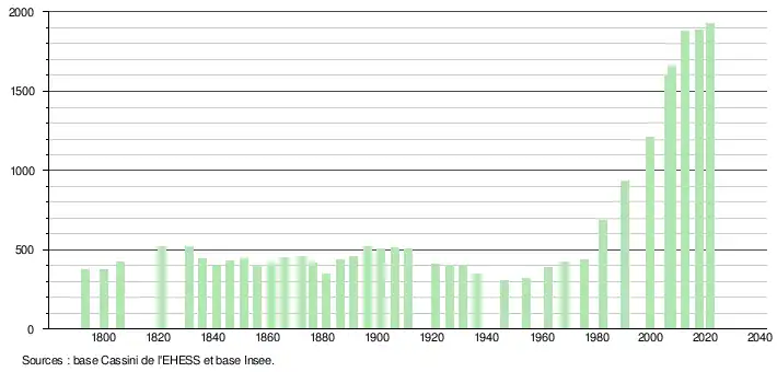 L'évolution du nombre d'habitants est connue à travers les recensements de la population effectués dans la commune depuis 1793. Pour les communes de moins de 10 000 habitants, une enquête de recensement portant sur toute la population est réalisée tous les cinq ans, les populations légales des années intermédiaires étant quant à elles estimées par interpolation ou extrapolation[27]. Pour la commune, le premier recensement exhaustif entrant dans le cadre du nouveau dispositif a été réalisé en 2007[28].