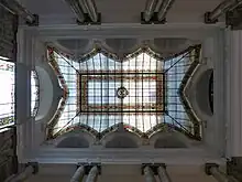 Le faux plafond est formé par un grand vitrail horizontal polychrome plat, qui se dresse sur une bande verticale, également avec des vitraux, et flanqué par d'autres dans une demi-voûte, tous réalisés par la Casa Maumejean Hermanos, à Madrid[3].