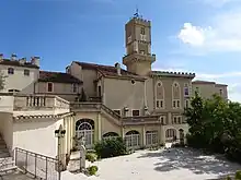 Le bâtiment, avec sa tour, ses créneaux et ses fenêtres à meneaux, constitue le château actuel, imaginé et construit par le fondateur, afin d'évoquer le château médiéval disparu au XVIe siècle.