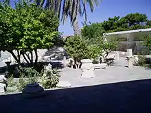 À l'extérieur du musée, dans les parterres le long de la rue piétonne montant depuis le port, des fragments architecturaux sont dispersés tandis que le long du mur ouest sont exposés trois sarcophages d'époque romaine, spécifiques à l'île durant cette période. Ils servaient de sépulture familiale. Les décors sculptés sur les parois représentent des scènes caractéristiques de l'art funéraire : banquet ou défunt assis. Les couvercles à pignon supportaient les bustes des défunts[5].