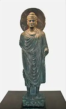 Datée du IIe siècle, cette sculpture est l’une des plus anciennes représentations humaines du Bouddha. Elle est représentative de l’art du Gandhara, qui s’est développé du Ier au IIIe siècle dans une région située entre l’Afghanistan et le Pakistan. Véritable carrefour culturel et commercial, le Gandhara a créé des œuvres originales, faisant la synthèse entre art indien et art gréco-romain.