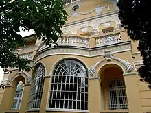 L'entrée monumentale est dotée d'un escalier à double volée ; elle mène à un hall vitré au-dessus duquel se trouve une terrasse plate avec une balustrade en béton[2].