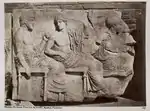 Photographie ancienne (1896). Frise de la face est du Parthénon, figurant Aphrodite, Apollon et Poséidon. |