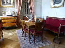 - Le petit salon de droite semble avoir été le bureau personnel du premier propriétaire. Une commode en acajou moucheté[21] porte l'estampille de G. Beneman, ébéniste du Roi à Paris. Une table rectangulaire à pieds tronconiques, transformée d'un piano-forte, porte au revers de la boîte de résonance une étiquette authentifiant le facteur de pianos parisien : « Érard frères et Cie, rue du Mail, no 37 à Paris, 1801 »[22]. Le canapé[23] et les chaises en acajou et velours rouge sont d'époque Restauration[23].