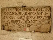 Deux d’entre elles sont familiales, les deux autres concernent respectivement le moine Guichard et le marchand ou artisan Aymon d’Ambronay. L’épitaphe est une inscription placée à proximité immédiate de la tombe, elle mentionne toujours le nom du mort et sa sépulture. Peuvent aussi figurer la date de son décès et la fonction du défunt. Trois épitaphes datent du VIe siècle, du Xe ou XIe siècle dont celle de Samuel, inscription en hébreu[10] qui atteste la présence[11] d’un cimetière juif dans Vienne, sans que l’on puisse le localiser et enfin une épitaphe de 1300 qui mentionne le moine et prêtre Aymon de la Chaîne.