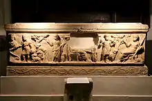 Le décor de ce sarcophage évoque un au-delà heureux, mais non nécessairement chrétien[4]. En effet ce sarcophage a été longtemps interprété comme l'un des plus anciens sarcophages chrétiens de la Gaule car on y voyait notamment une représentation du bon pasteur[3]. En réalité cette face principale représente de gauche à droite : un buste du dieu solaire, un pêcheur à la ligne, un arbre, trois brebis et une ancre, une orante les mains ouvertes, un deuxième arbre, une femme assise devant laquelle se trouve un enfant, un troisième arbre, un berger portant une brebis, un quatrième arbre et, dans l'angle, un philosophe assis[3].