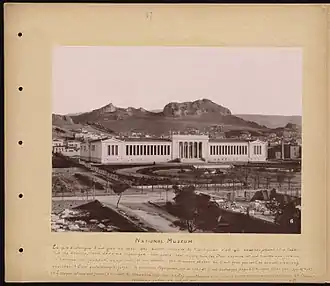 La construction prit cependant du retard en raison du décès de Panagiótis Kálkos, remplacé par Armódios Vláchos[9], puis de problèmes de financement. La partie centrale de l'aile ouest fut achevée en 1874. Le principal changement par rapport aux plans de Lange était la disparition de la colonnade. Theophil Hansen fut contacté. On lui proposa de poursuivre la construction. Il refusa : il n'aimait pas les plans de Lange. Il suggéra par contre de tout reprendre à zéro, au sud de l'Acropole, pour un coût de sept millions de drachmes. L'État grec refusa. Finalement, son élève Ernst Ziller accepta de prendre la relève. Il remania les plans de Lange et donna au musée son aspect néo-classique. Il reprit la proposition qu'il avait faite pour le musée archéologique d'Olympie : un portique avec quatre colonnes ioniques en façade et une de chaque côté de la porte ; deux galeries latérales à pilastres carrés terminées par un portique avec un fronton vide et des statues de terre cuite au-dessus du porche (la marque de fabrique de Ziller). L'aile sud fut complétée en 1885 et l'aile nord en 1889. Commencé en 1866, le bâtiment principal fut achevé en 1889 grâce à des financements de l’État grec (qui à partir de 1854 réserva sur son budget annuel la somme insuffisante de 10 000 drachmes), de la Société archéologique d'Athènes et de mécènes dont Eléni Tosítsa qui offrit le terrain, Dimítrios Bernardákis (en), un Grec vivant à Saint-Pétersbourg, qui donna 200 000 drachmes en 1856 puis son fils, Nikólaos, qui offrit 100 000 francs au début des années 1870[1],[10],[7],[11],[12].