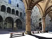 La cour (cortile en italien), dotée de portiques sur trois côtés avec des arcs en plein cintre sur des piliers octogonaux, a été construite au XIIIe siècle et enrichie au siècle suivant par le balcon et l'escalier gothiques, ce dernier construit sur un côté sans portique par Neri di Fioravante entre 1345 et 1367.