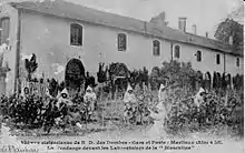 Les vendanges à l'abbaye, d'après une carte postale ancienne. Le vaste bâtiment du second plan abrite le laboratoire de la Musculine.
