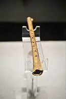 Quant aux flûtes, le Moustérien du gisement de la Quina en Charente livre une phalange sifflante à deux trous qui est déjà une étape vers la flûte[44],[note 5]. La série de flûtes de la grotte d'Isturitz, dans les Pyrénées-Atlantiques, témoigne d'une remarquable continuité de facture depuis l'Aurignacien jusqu'au Magdalénien, soit d'environ 30 000 à 12 000 ans avant le présent, pratiquement toute la durée du Paléolithique supérieur. Le cubitus de vautour est le tube naturel le mieux adapté comme matière première. Le façonnage doit être soigné : l'extrémité la plus large de l'os constitue une sorte de pavillon et l'autre extrémité forme l'embouchure, il faut sectionner ces extrémités à la longueur propice au fonctionnement acoustique visé, percer les trous aux emplacements adéquats, creuser les bords biseautés qui facilitent le placement des doigts, gratter la surface de l'os, etc. La flûte en os de fou de Bassan de la grotte de Tore par exemple a exigé une gravure spécialement minutieuse. L'espacement régulier des trous démontre l'intention d'obtenir des sons de hauteurs précises ; certains exemplaires aux trous rapprochés donnent de très petits intervalles de l'ordre du quart de ton ; des os tubulaires sans aucun trou peuvent aussi servir de flûte à la note naturelle du tube, ou servir d'appeau, ou servir dans des assemblages du type flûte de Pan. Comme pour les phalanges sifflantes, la forme des trous peut rester irrégulière sans détériorer les qualités sonores d'une flûte car c'est la régularité des espacements qui importe. On observe normalement un lustré d'usage au bord des trous et à l'embouchure. L'élaboration poussée des premiers exemplaires connus suggère une maîtrise antérieure (dès le Paléolithique moyen) dont les vestiges ne nous seraient pas parvenus parce que végétaux[45].