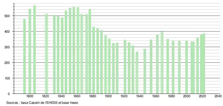 L'évolution du nombre d'habitants est connue à travers les recensements de la population effectués dans la commune depuis 1793. Pour les communes de moins de 10 000 habitants, une enquête de recensement portant sur toute la population est réalisée tous les cinq ans, les populations légales des années intermédiaires étant quant à elles estimées par interpolation ou extrapolation[14]. Pour la commune, le premier recensement exhaustif entrant dans le cadre du nouveau dispositif a été réalisé en 2008[15].