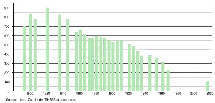 L'évolution du nombre d'habitants est connue à travers les recensements de la population effectués dans la commune depuis 1793. Pour les communes de moins de 10 000 habitants, une enquête de recensement portant sur toute la population est réalisée tous les cinq ans, les populations légales des années intermédiaires étant quant à elles estimées par interpolation ou extrapolation[3]. Pour la commune, le premier recensement exhaustif entrant dans le cadre du nouveau dispositif a été réalisé en 2007[4].