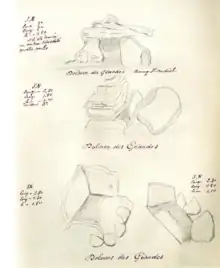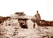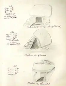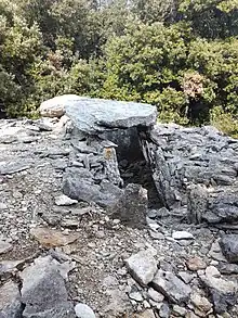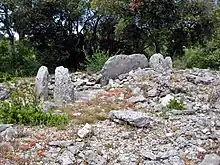- Une construction mégalithique, authentifiée par Léopold Chiron comme étant une structure dolménique à part entière, est associée dolmen no 1[42]. Cette construction dite « annexe » a fait l'objet d'une destruction durant d'anciens travaux archéologiques[42]. Le supposé septième dolmen étudié et croqué par Chiron serait possiblement une tombe complémentaire au dolmen no 1 et dont la mise en œuvre lui serait ultérieure[42].