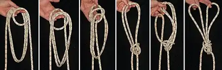 Le nœud peut être réalisé en partant de gauche à droite. Une fois le nœud terminé, le brin longitudinal est toujours du côté du départ, le brin latéral du côté où la boucle a été construite.