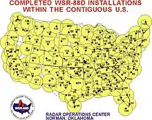 Le premier de ces nouveaux radars fut terminé à l’automne 1990 à Norman (Oklahoma) comme système de démonstration et le premier radar opérationnel fut inauguré à Sterling (Virginie) le . Pour installer les 160 radars du programme, il fallut un certain temps et le dernier NEXRAD, celui de North Webster (Indiana), date du . Les sites radars ont été choisis afin de couvrir le maximum du territoire américain et pour fournir une certaine zone de recouvrement en cas de panne d'un radar[7].