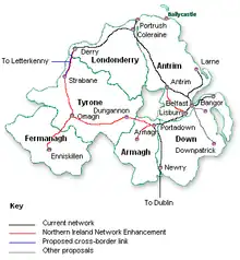 - L'amélioration de l'infrastructure sur le trajet Belfast-Derry, ou au minimum la mise en place de voies d'évitement, afin de permettre une fréquence de trains plus élevée et une vitesse augmentée.